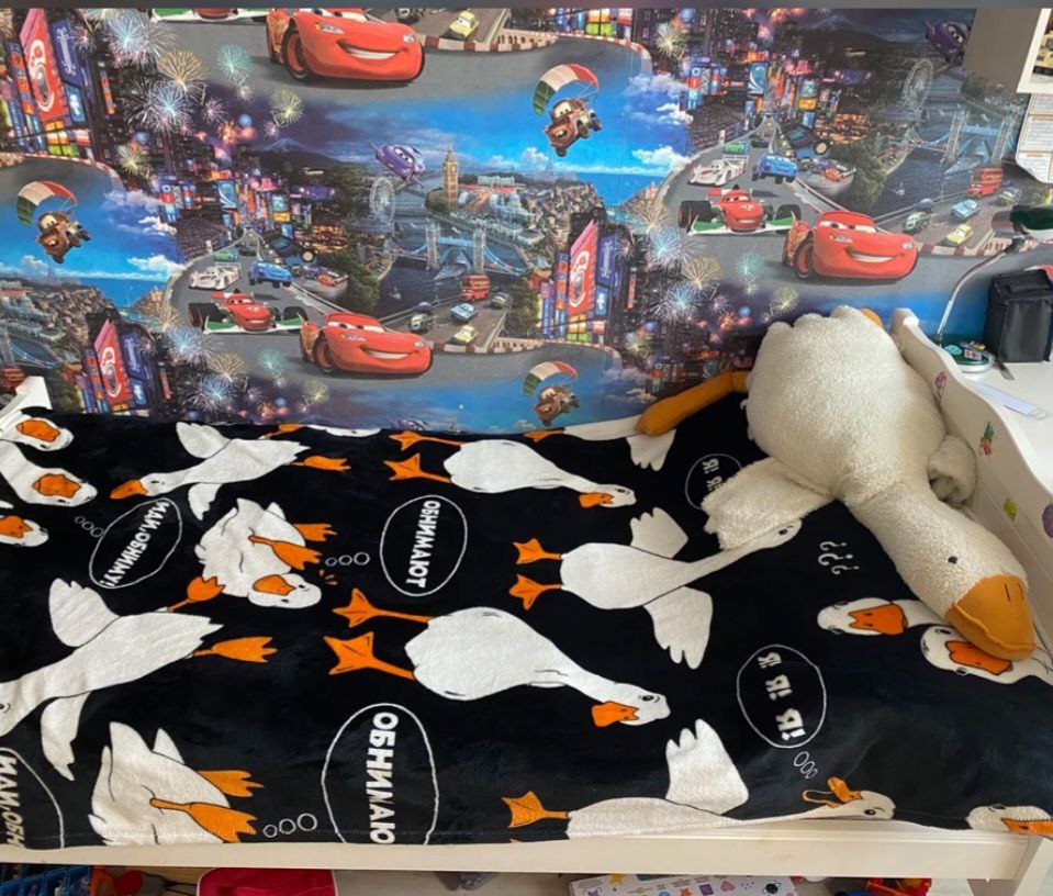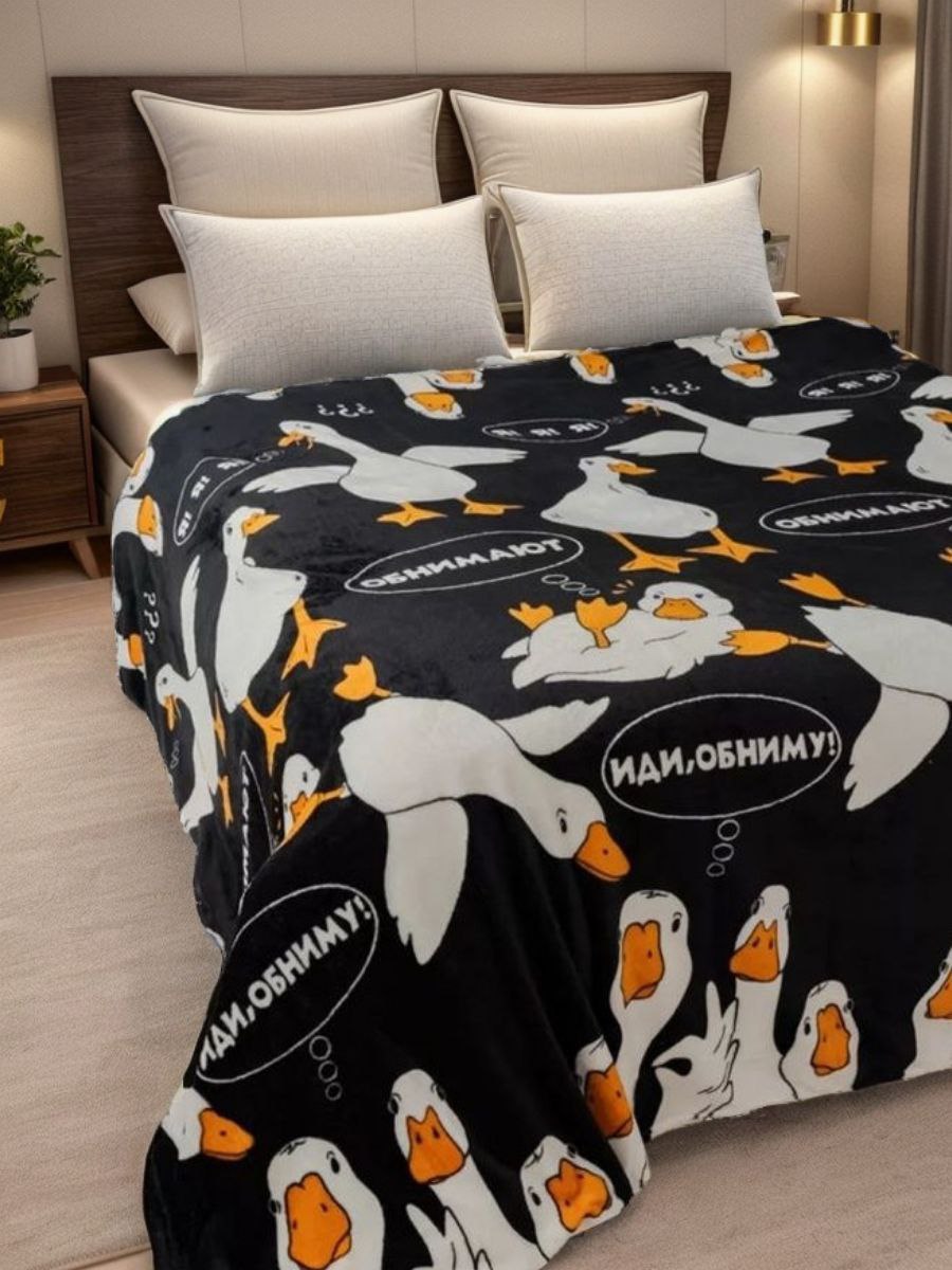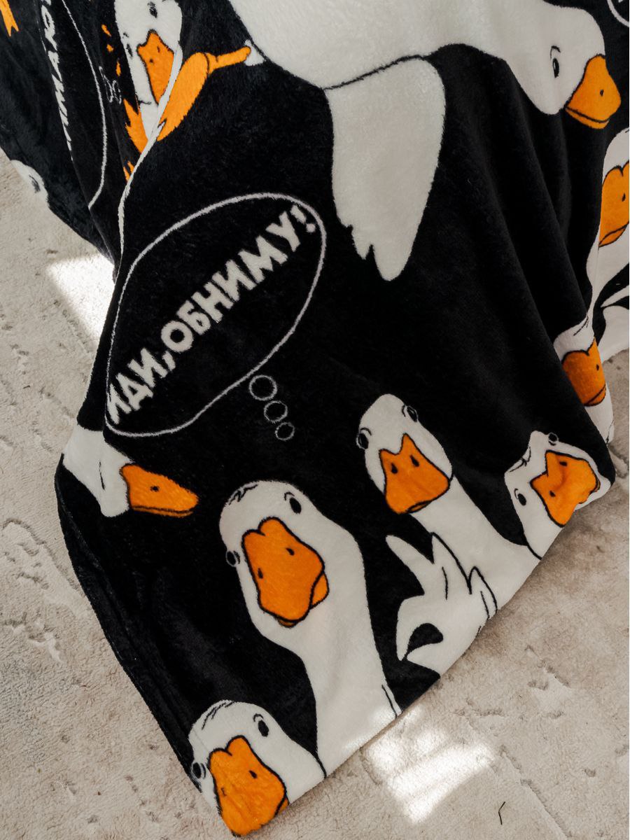 Плед ГУСЬ-ОБНИМУСЬ 170 х 200 см из ворсового полотна со стильными разноплановыми рисунками не оставит равнодушным никого. Плед подойдет детям и взрослым. Невероятно мягкий, пушистый, отлично впишется в любой дизайн интерьера детской комнаты, гостиной, спальни, кухни. Он не мнется, не линяет, легко стирается и не требует глажки.