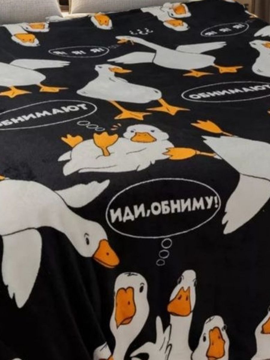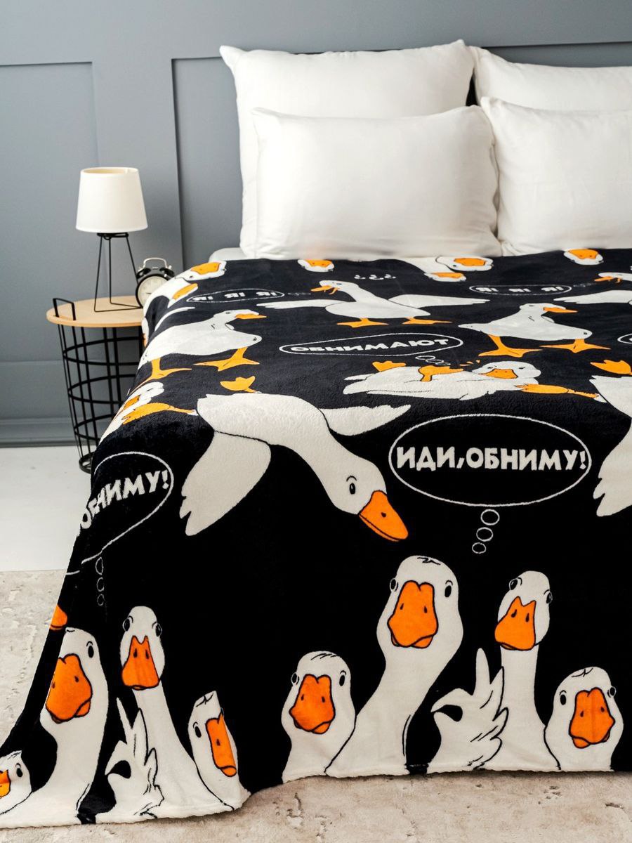 Плед ГУСЬ-ОБНИМУСЬ 170 х 200 см из ворсового полотна со стильными разноплановыми рисунками не оставит равнодушным никого. Плед подойдет детям и взрослым. Невероятно мягкий, пушистый, отлично впишется в любой дизайн интерьера детской комнаты, гостиной, спальни, кухни. Он не мнется, не линяет, легко стирается и не требует глажки.